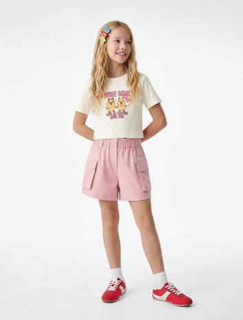 Kız Çocuk Kısa Kollu Slim Fit Bisiklet Yaka Pamuklu Crop Baskılı Tişört