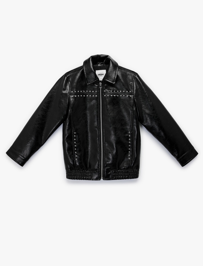 Fermuarlı Zımba Detaylı Uzun Kollu Suni Deri Ceket Sepete Ekle