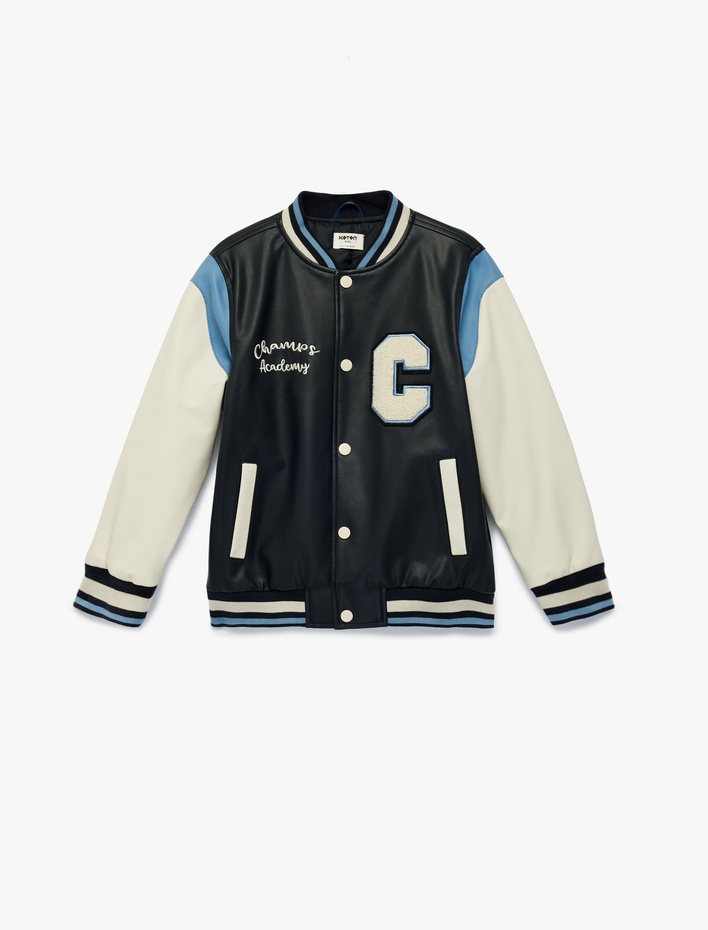 Uzun Kollu Bisiklet Yaka Suni Deri Bomber Kolej Ceket Sepete Ekle