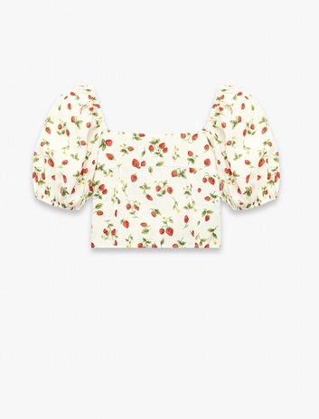 Keten Viskon Karışımlı Gipeli Slim Fit Poplin Kare Yaka Crop Balon Kollu Çilek Desenli Bluz Sepete Ekle