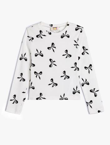 Kız Çocuk Fiyonk Baskılı Tişört Uzun Kollu Bisiklet Yaka Pamuklu