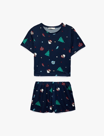 Kısa Kollu U Yaka Baskılı Şortlu Yılbaşı Pijama Takımı