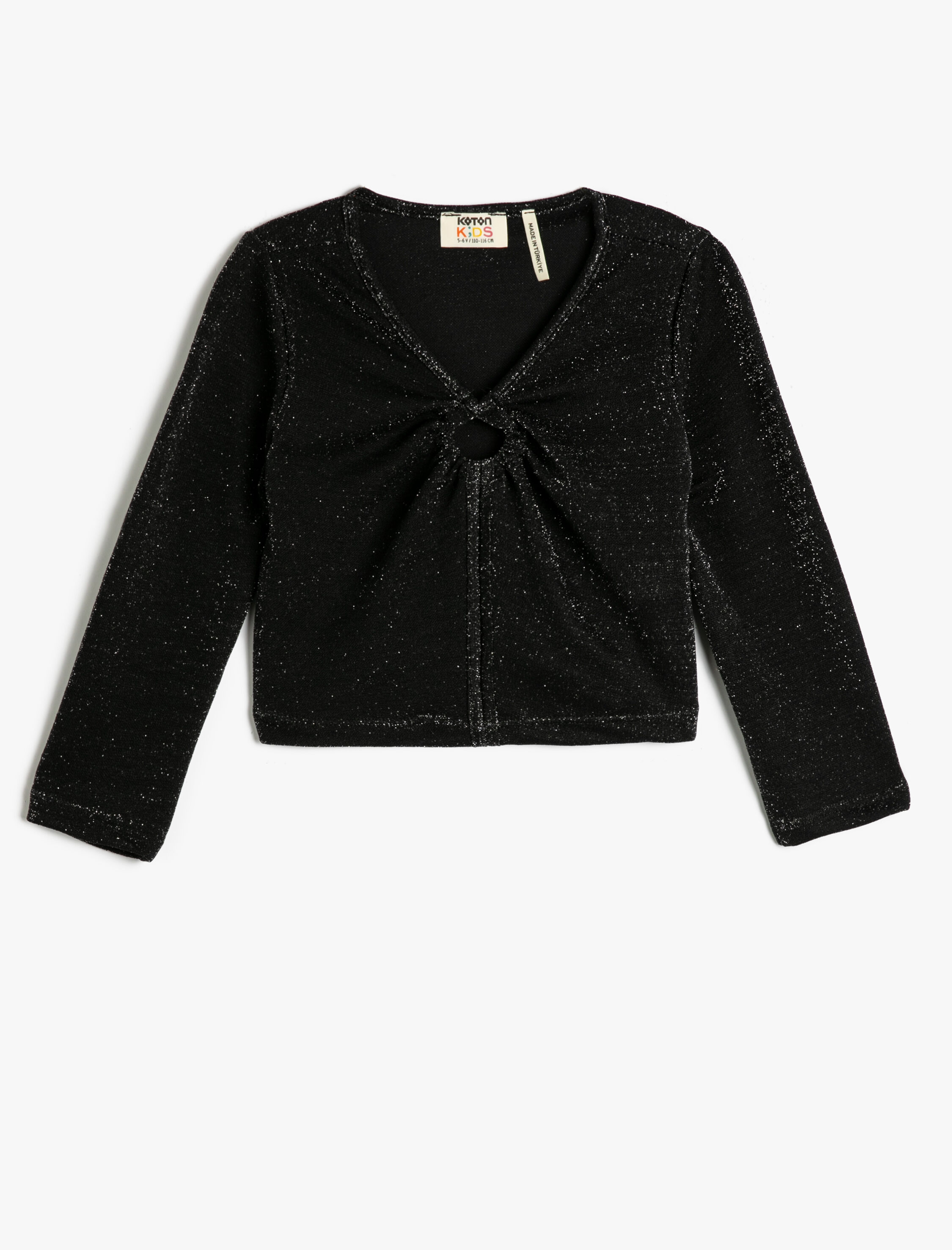 Kız Çocuk Crop Bluz Uzun Kollu Önü Büzgülü Parıltılı V Yaka Dar Kalıp