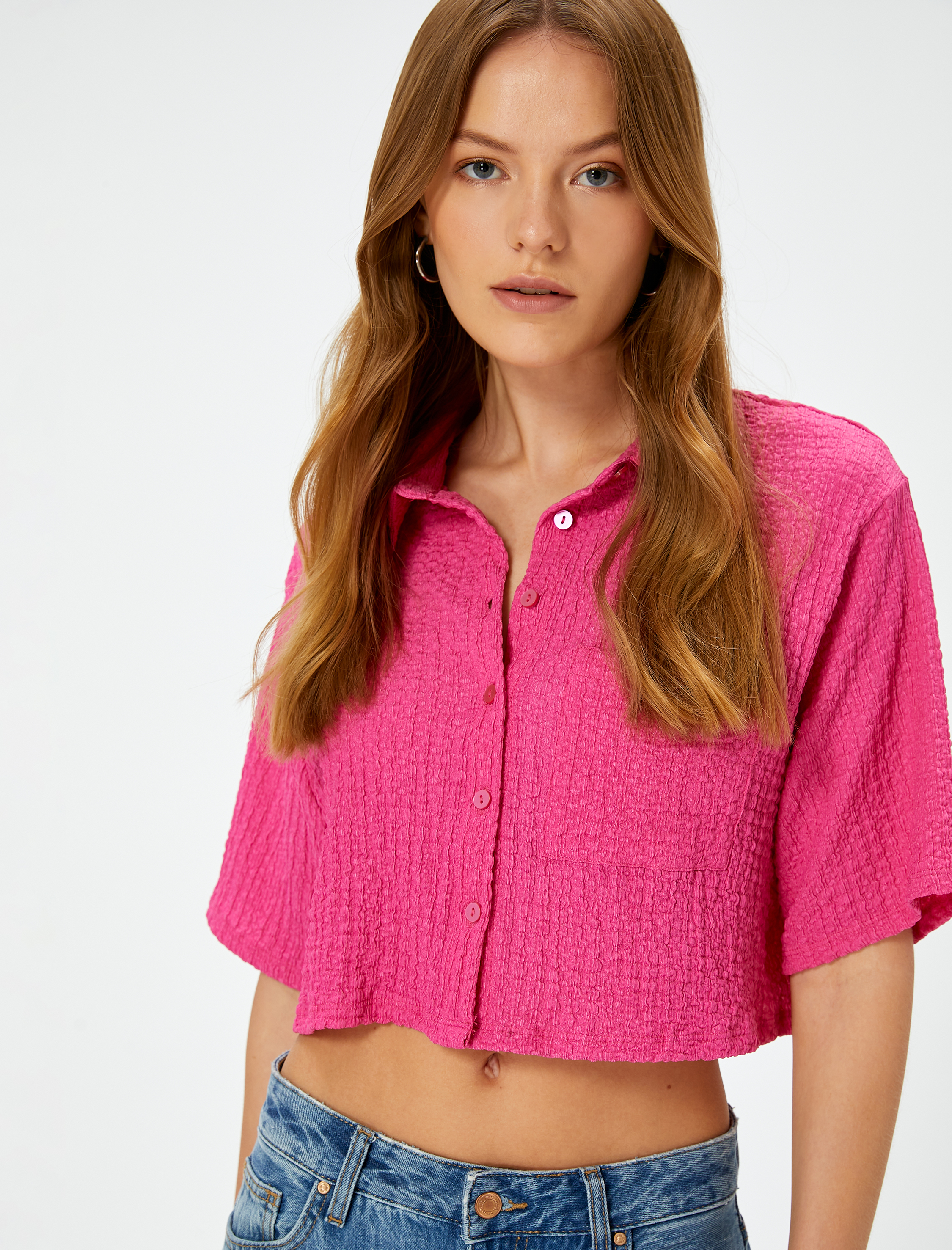 Crop Gömlek Dokulu Kısa Kollu Düğmeli