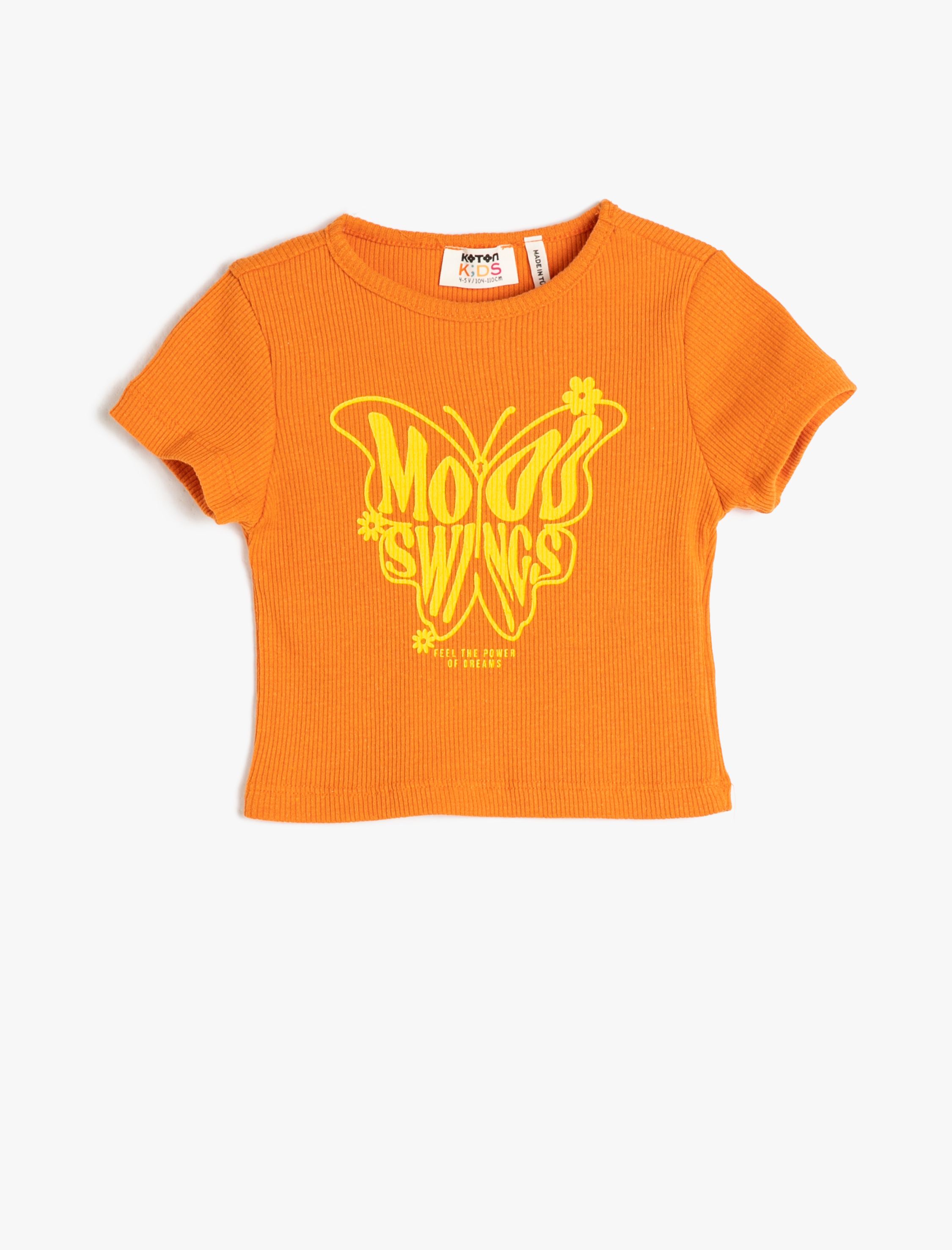 Kız Çocuk Crop Tişört Kısa Kollu Bisiklet Yaka Baskılı Pamuklu Fitilli