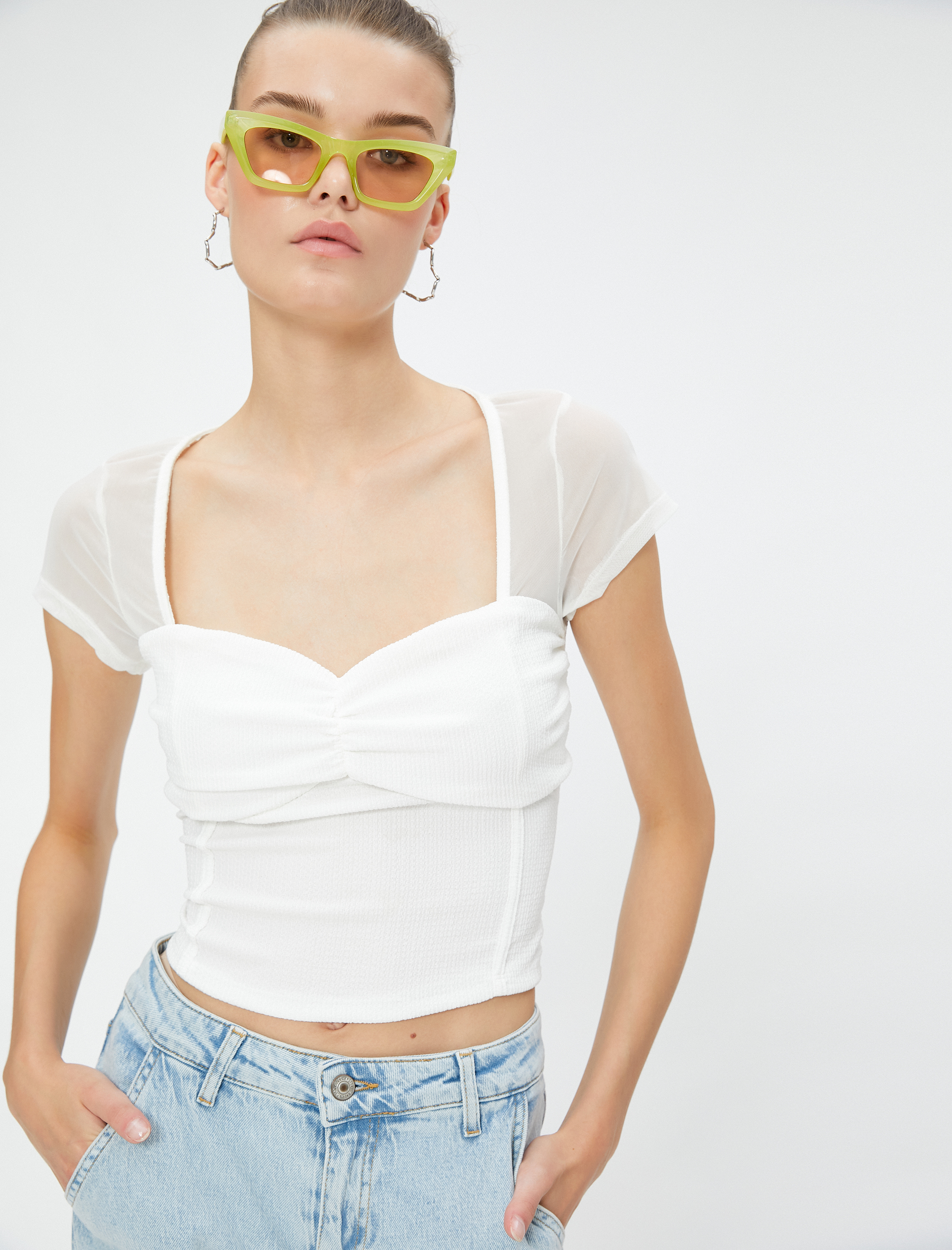 Crop Tişört Transparan Detaylı Kalp Yaka Bürümcük