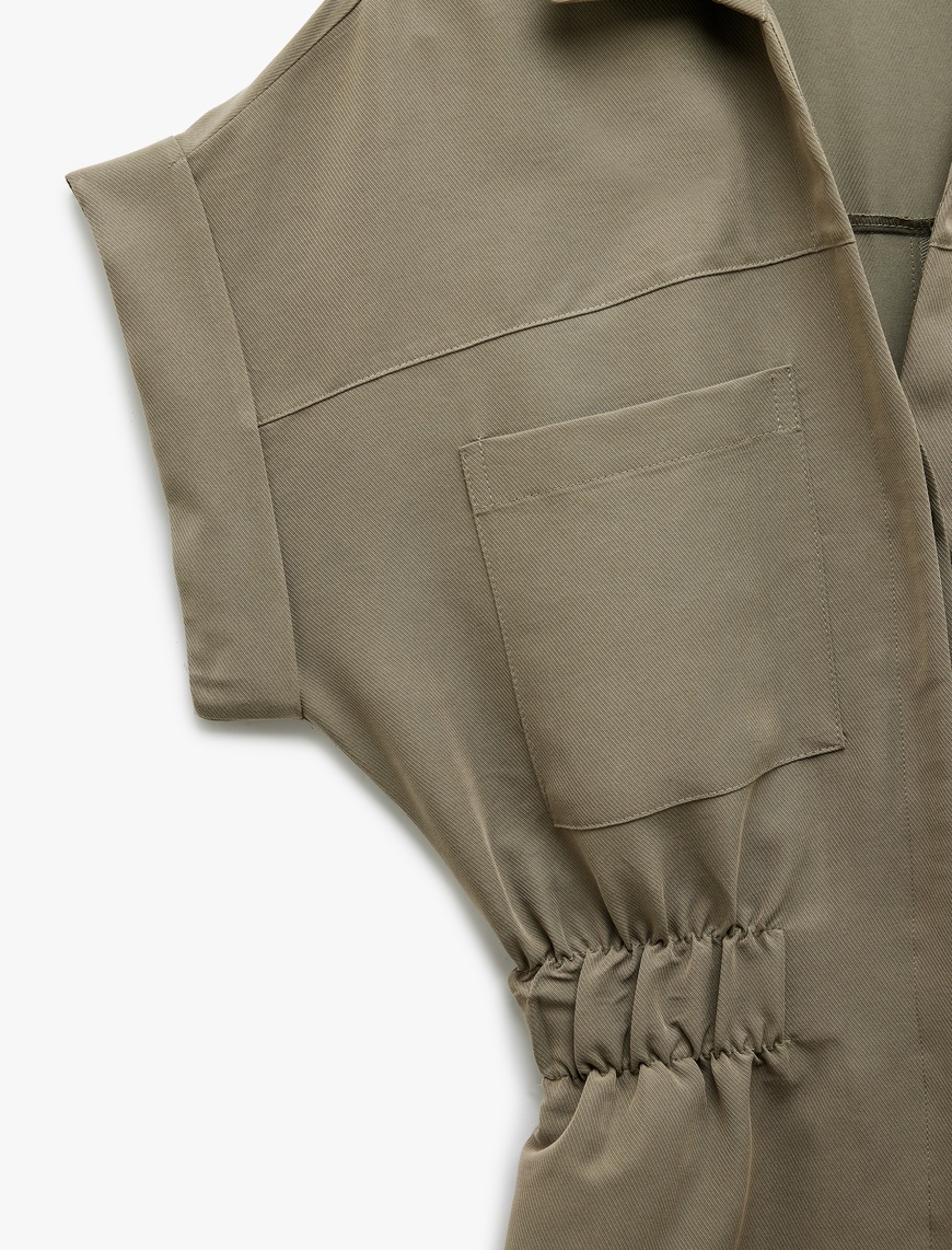 Cupro Modal Kumaş Cep Detaylı Beli Lastikli Kısa Kollu Gömlek Yaka Şort Tulum