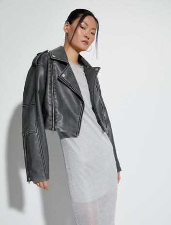 Oversize Suni Deri Ceket Fermuarlı Soluk Efektli