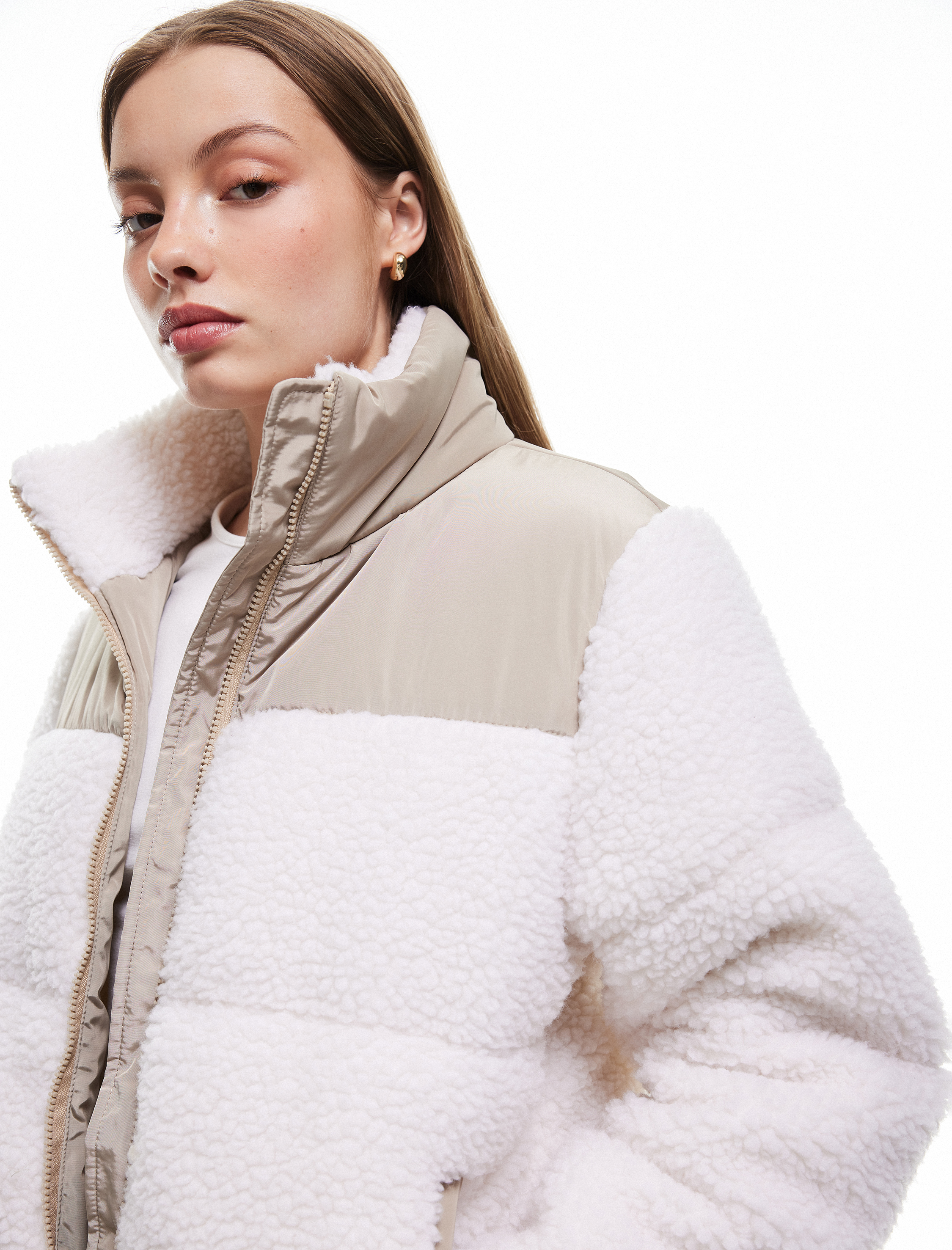 Dik Yaka Cep Detaylı Fermuarlı Renk Bloklu Peluş Mont