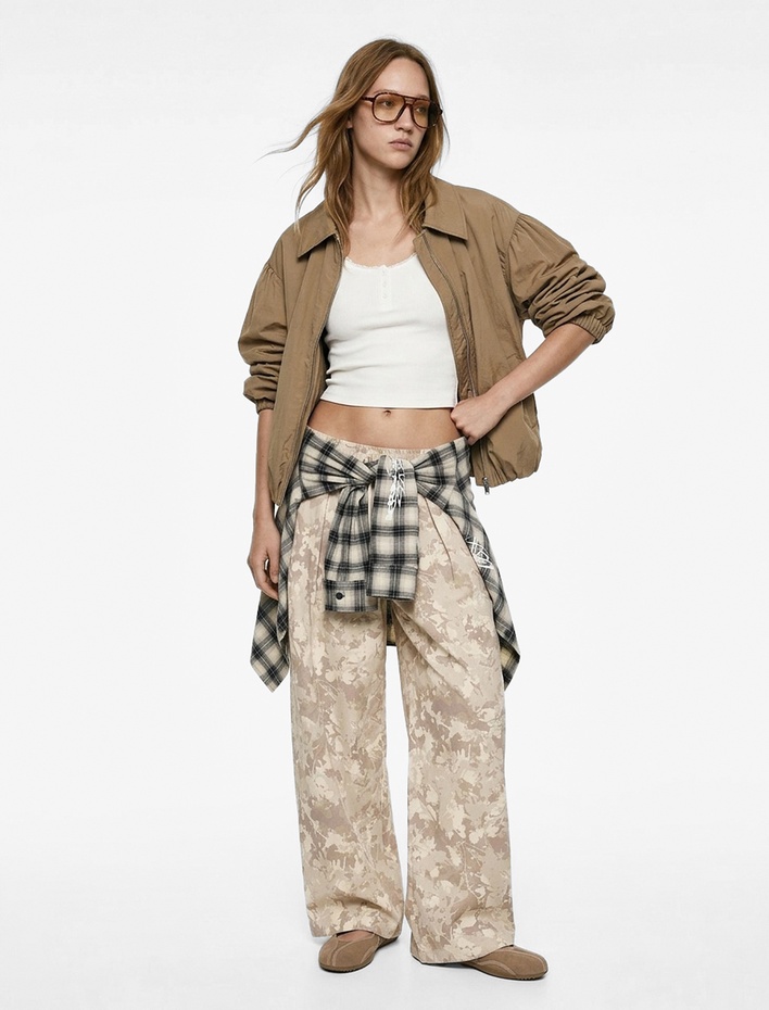 Uzun Kollu Viskon Karışımlı Desenli Cepli Renk Kontrastlı Gömlek Yaka Fermuarlı Bomber Ceket Sepete Ekle