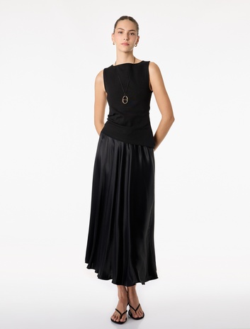 Beli Lastikli Pileli Uzun Saten Kloş Etek