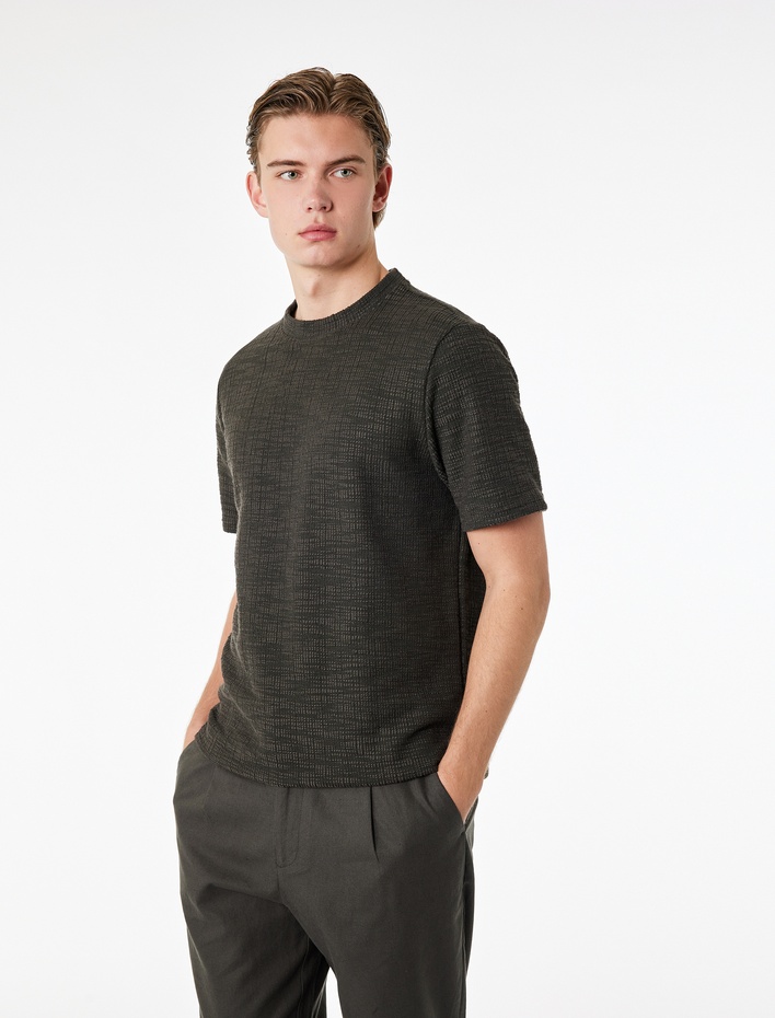 Regular Fit Kısa Kollu Dokulu Tok Kumaş Bisiklet Yaka Tişört