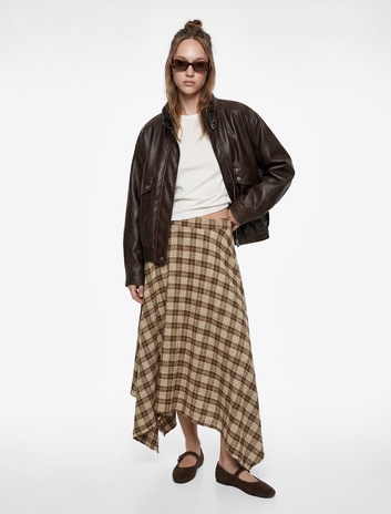 Rahat Kalıp Normal Bel Viskon Karışımlı Ekoseli Midi Asimetrik Etek