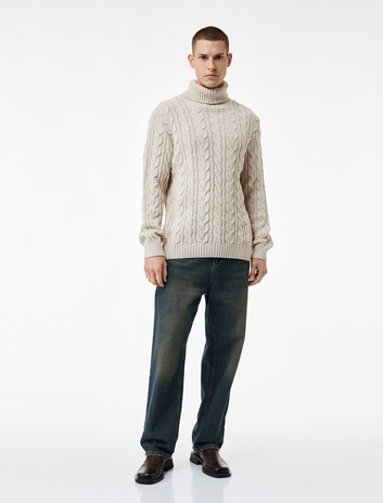 Uzun Kollu Saç Örgü Dokulu Boğazlı Triko Kazak