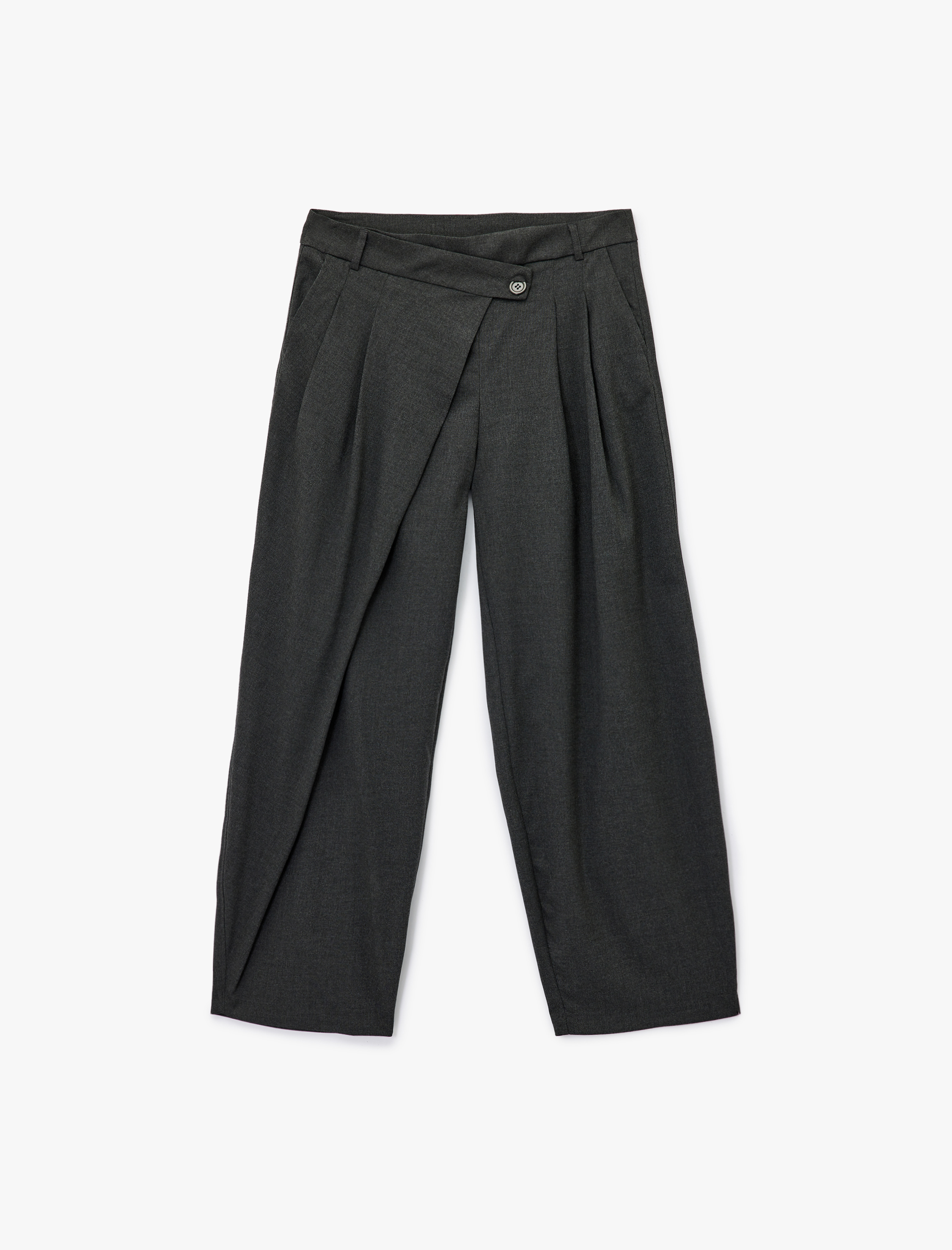 Düğme Detaylı Asimetrik Kesim Cepli Viskon Kumaş Geniş Paça Kumaş Pantolon