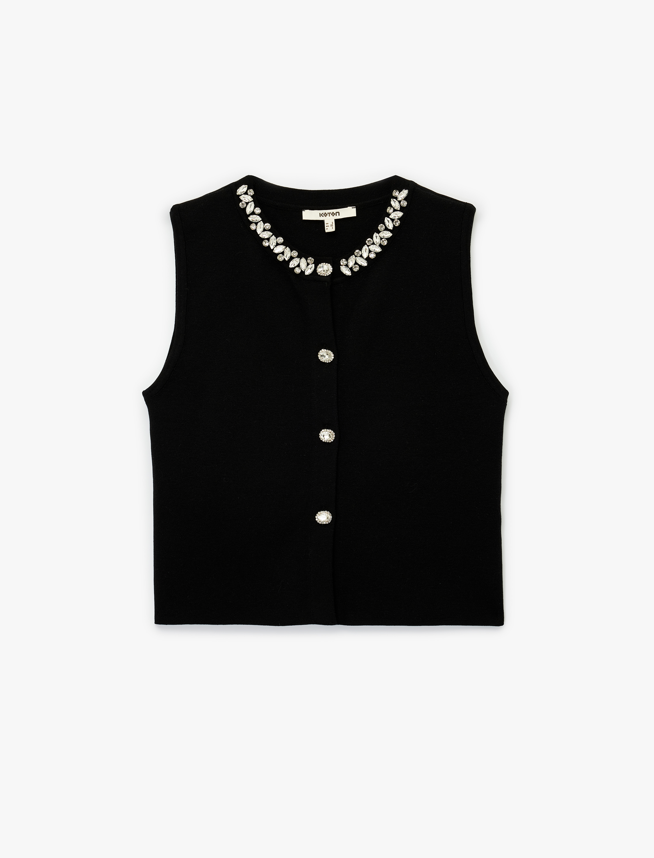 Düğmeli Bisiklet Yaka Taşlı Triko Yelek