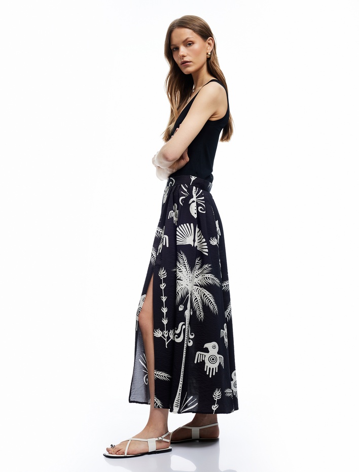 Etnik Desenli Viskon Kumaş Çan Kesim Uzun Kloş Etek