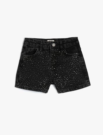 Kız Çocuk Mini Kot Şort Taş Baskılı Cepli Pamuklu