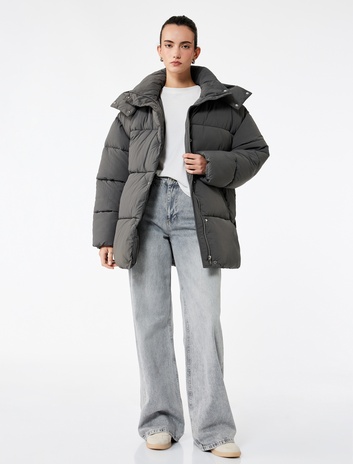 Fermuarlı Cepli Çıkarılabilir Kapüşonlu Uzun Kollu Su İtici Oversize Şişme Mont