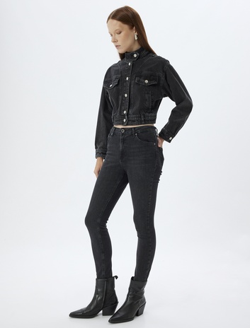 Yüksek Bel Kot Pantolon Dar Paça Düğmeli Cepli - Skinny Fit Jean
