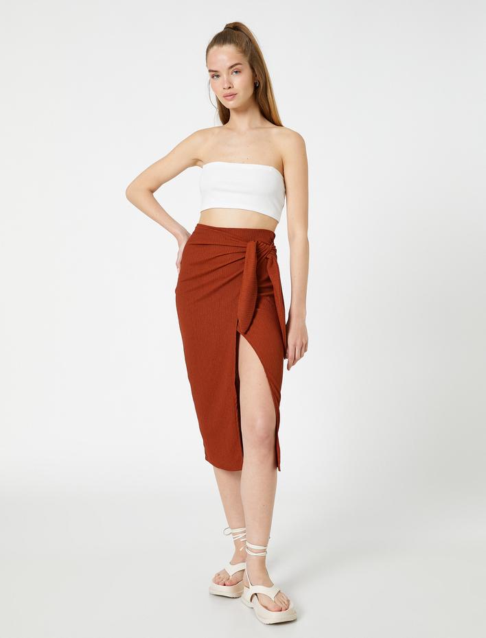 Midi Etek Yırtmaçlı Fitilli Viskon Karışımlı Normal Bel