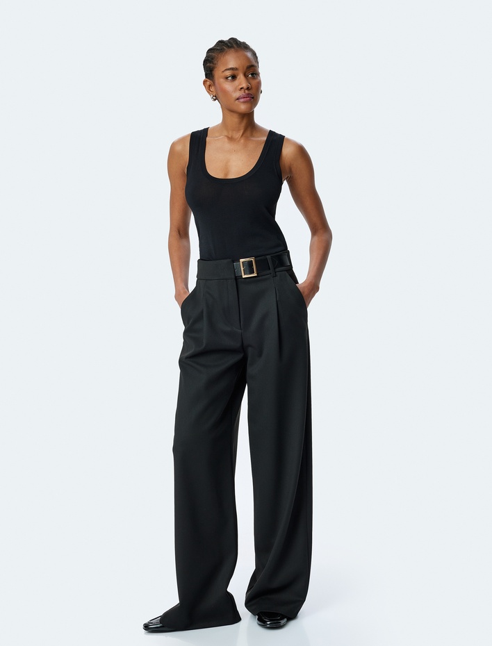 Yan Cepli Kemer Detaylı Geniş Paça Kumaş Pantolon