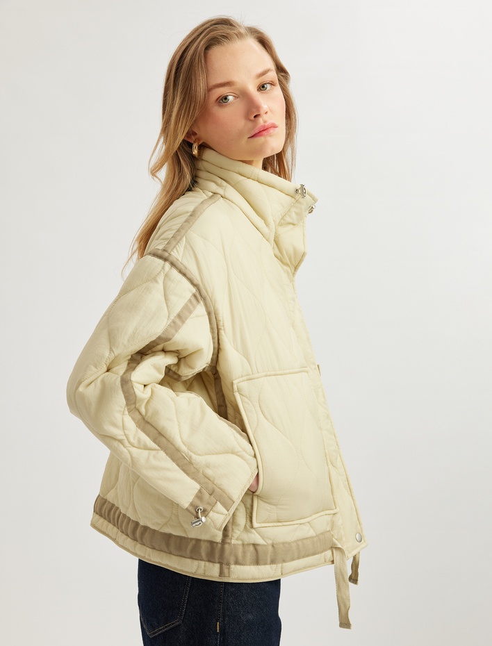 Kemer Detaylı Dik Yaka Uzun Kollu Fermuarlı Cepli Oversize Kapitone Mont Sepete Ekle
