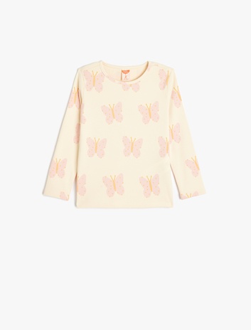 Kız Bebek Kelebek Baskılı Bisiklet Yaka Uzun Kollu Pamuklu Tişört