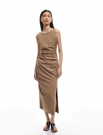 Drape Detaylı Kolsuz Yırtmaçlı Midi Boy Kayık Yaka Elbise
