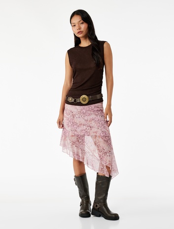 Asimetrik Kesim Yüksek Bel Katlı Midi Tül Etek