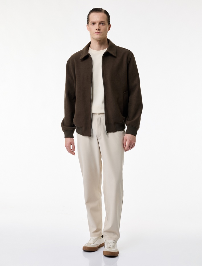Uzun Kollu Cepli Fermuarlı Gömlek Yaka Kaşe Bomber Ceket