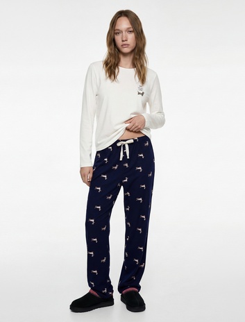 Uzun Kollu Bisiklet Yaka Köpek Desenli Pamuklu Pijama Takımı