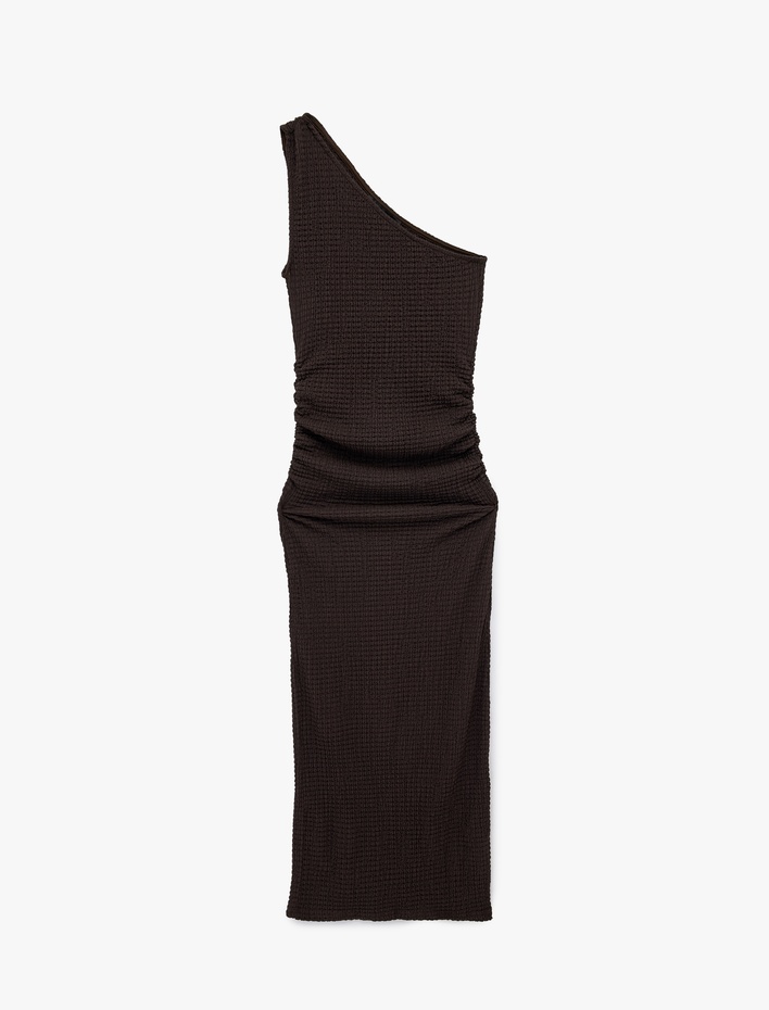 Tek Omuz Kolsuz Yırtmaç Detaylı Drapeli Midi Elbise Sepete Ekle