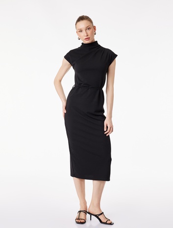 Drapeli Dik Yaka Kolsuz Midi Elbise