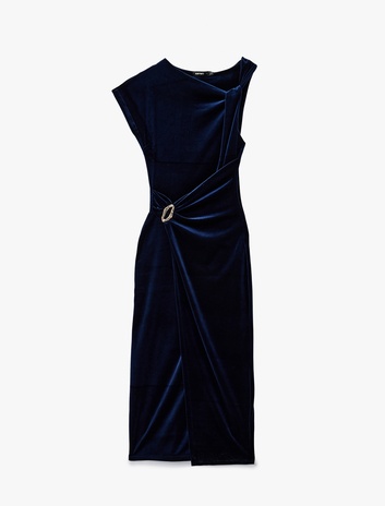 Aksesuarlı Kolsuz Yırtmaçlı Asimetrik Kruvaze Midi Boy Kadife Elbise Sepete Ekle