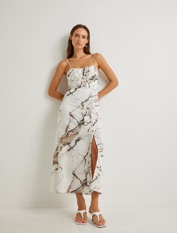 Koton X Şahika Ercümen - Midi Boy Askılı Elbise Arkası Bağlama Detaylı Soyut Desenli Astarlı Sepete Ekle