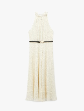 Kemer Detaylı Şifon Halter Yaka Kolsuz Puantiyeli Uzun Elbise Sepete Ekle