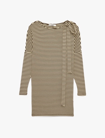 Viskon Bağlama Detaylı Çizgili Kayık Yaka Uzun Kollu Mini Elbise Sepete Ekle