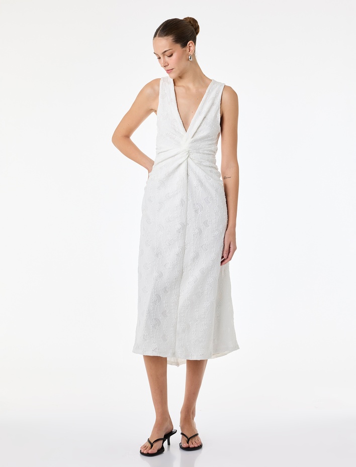 { "id": "8684848604235", "name": "Slim Fit Kolsuz Floral Dokulu Düğüm Detaylı V Yaka Uzun Elbise", "taxonomy":["CITY FASHION","CITY FASHION","WOMEN","JERSEY","DRESSES"], "currency": "TRY", "unit_price": 1299.99 , "unit_sale_price": 1299.99 , "url": "https://www.koton.com/slim-fit-kolsuz-floral-dokulu-dugum-detayli-v-yaka-uzun-elbise-beyaz-4148449-2/", "stock": 29, "color": "BEYAZ", "size": "XL", "product_image_url": "https://ktnimg2.mncdn.com/products/2026/03/16/3215299/18aa277f-a12d-4d19-9e5e-026326d35783_size870x1142.jpg" }