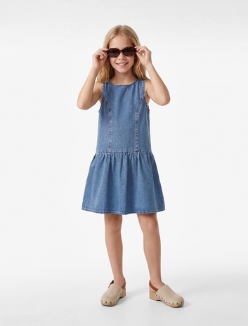 Kız Çocuk Pamuklu Bol Kalıp Kolsuz Bisiklet Yaka Balon Denim Elbise