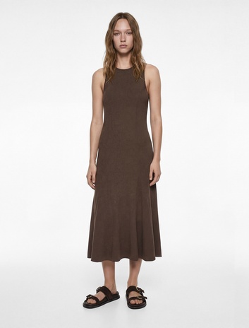 Rahat Kalıp Bisiklet Yaka Dikiş Detaylı Bürümcük Kolsuz Uzun Kloş Elbise