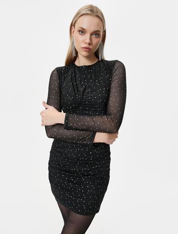 Tül Puantiyeli Mini Elbise Drape Detaylı Yuvarlak Yaka Uzun Kollu Sepete Ekle