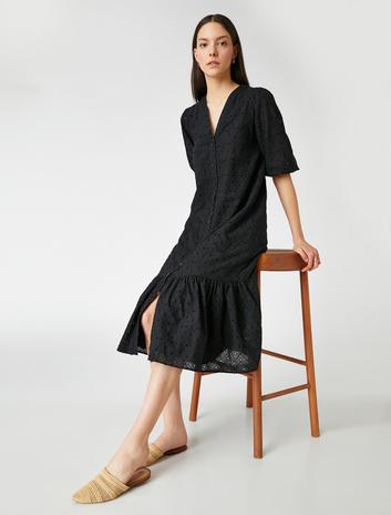 Fisto Fırfırlı Elbise V Yaka Midi Boy