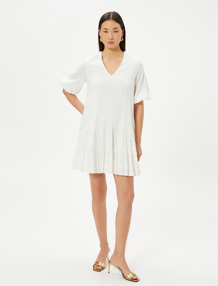 Balon Kol Elbise Mini V Yaka Volanlı Dokulu Sepete Ekle