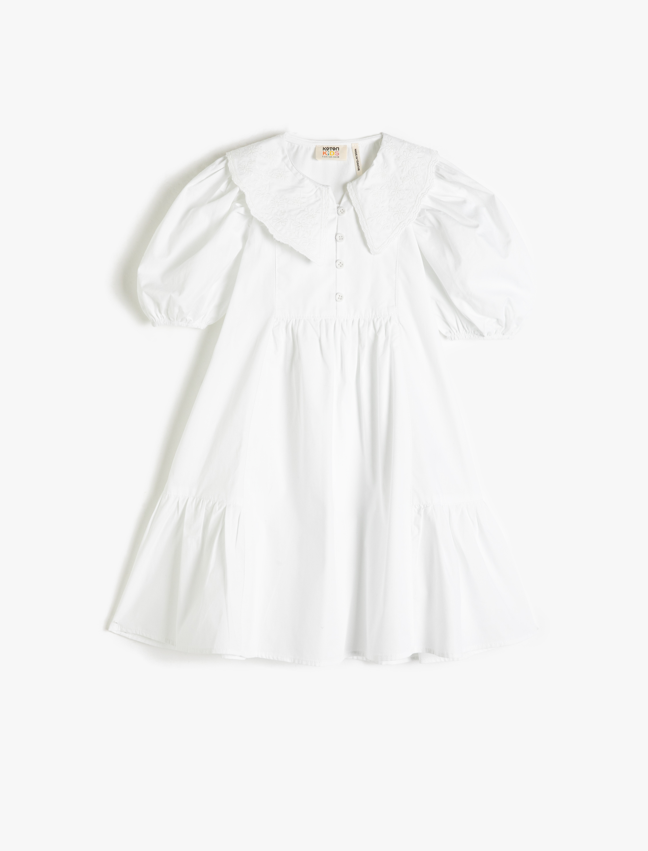 Rahatlık ve şıklığı bir arada sunan geniş bebe yaka, lastikli kısa balon kollu, düğmeli, işleme detaylı, pamuklu elbise ile kızınız sevimliliğine sevimlilik katacak.