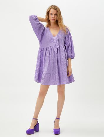 Mini Gömlek Elbise Kemer Detaylı Volanlı Balon Kollu Sepete Ekle