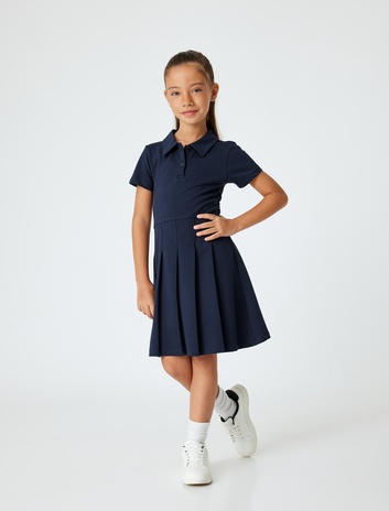 Kız Çocuk Kısa Kollu Düğme Detaylı Pamuklu Gömlek Yaka Okul Elbisesi