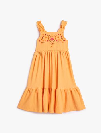 Kız Çocuk Elbise Askılı Fırfırlı Midi Boy Çiçek İşlemeli