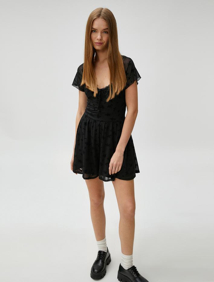 Şifon Mini Tulum Dantelli Çiçekli Kısa Kollu