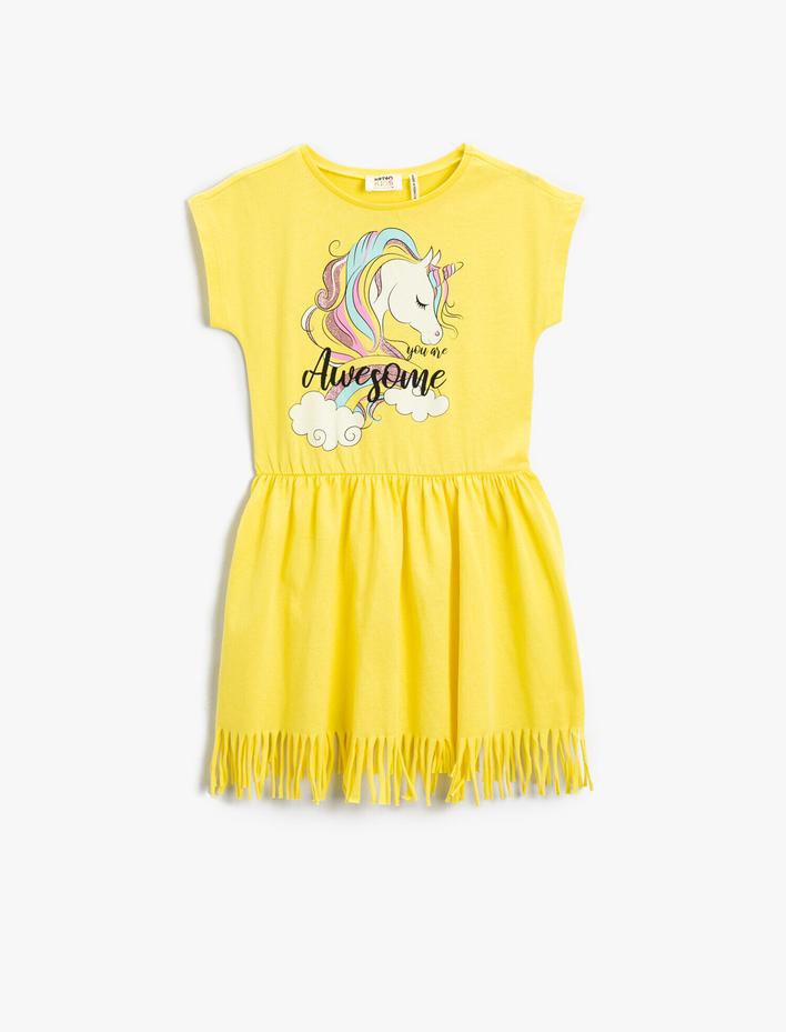 Penye Elbise Püsküllü Unicorn Baskılı Kısa Kollu Pamuklu Sepete Ekle
